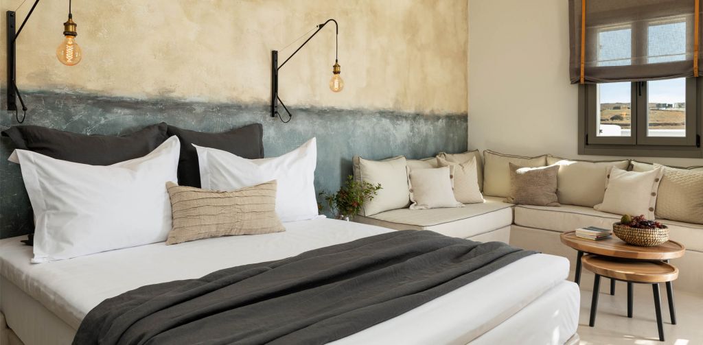 Stylish surroundings meet effortless luxury in the minimally adorned spacious Kythnos Suite with Private Pool. Showcasing the Cycladic style, the upscale interior unfolds in two floors. The patterned wall over the double bed resembles an artistic masterpiece that blends perfectly with the immaculate furnishing, handpicked and tailor-made by COCO-MAT. Immerse yourself to its spacious sitting area and indulge in its top-notch amenities; an extra double bed, two sleek bathrooms, a petite open closet and a sofa make for a sanctuary to host your laid-back moments. Step out to the private terrace, to splash in the enthralling pool.